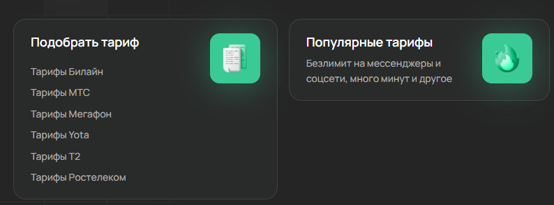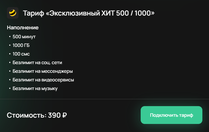 Здесь собраны выгодные тарифы от ведущих операторов сотовой связи России. Вы можете выбрать оптимальный вариант с нужным количеством минут, СМС и интернета, а также с безлимитом на соцсети и мессенджеры.