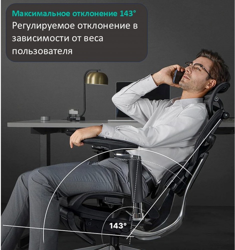 Синхромеханизм наклона допускает максимальное отклонение спинки назад на 143 градуса.